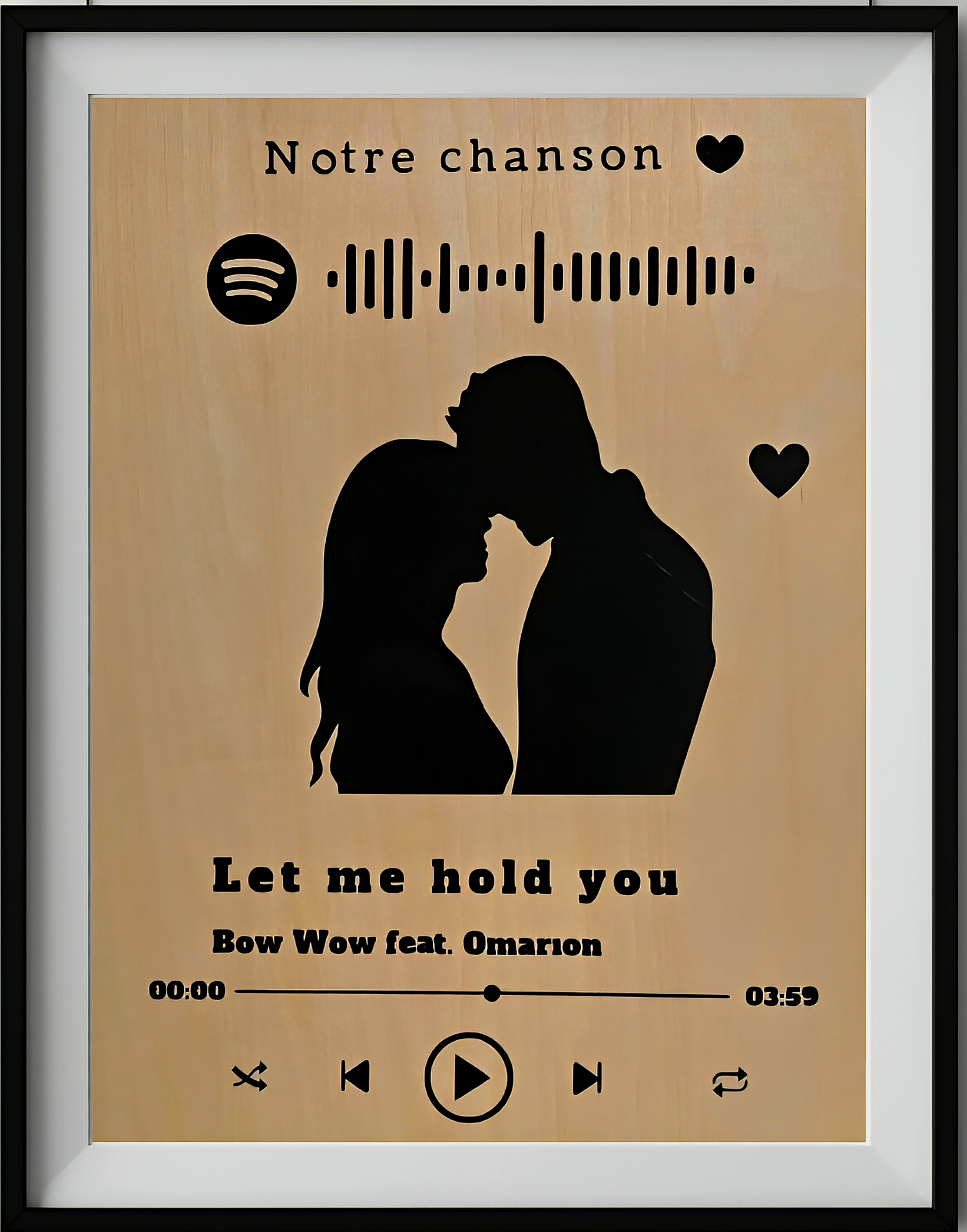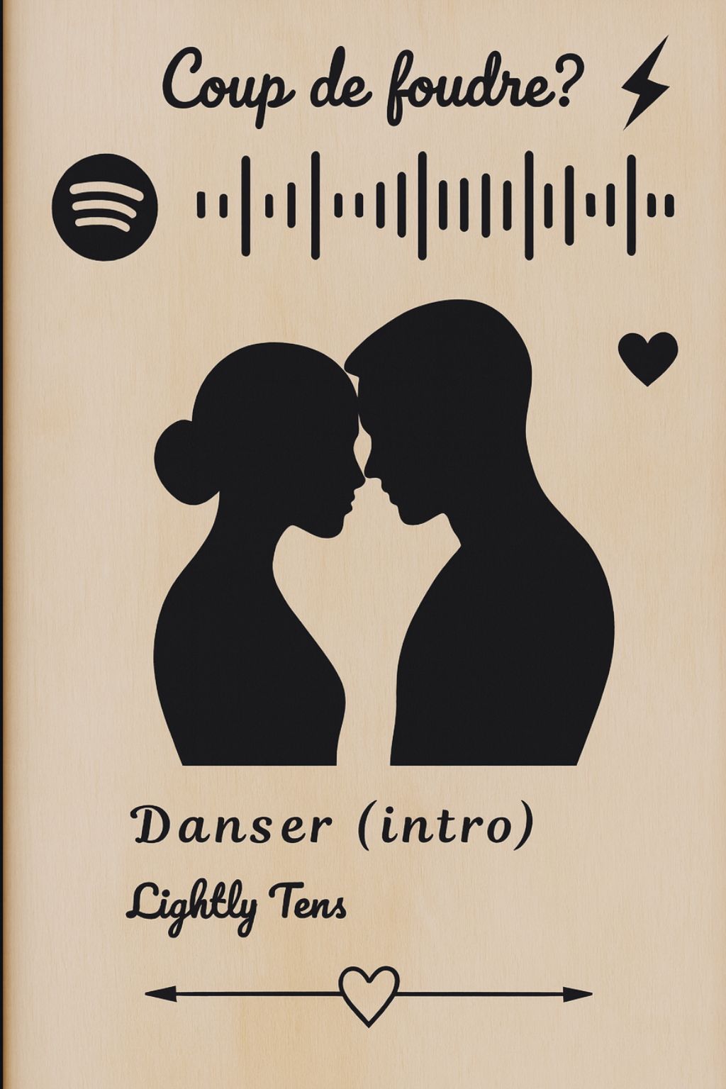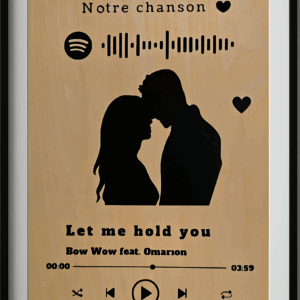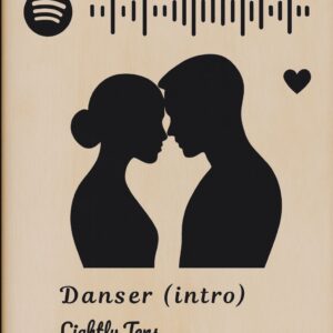 Ce cadre Spotify en bois naturel est entièrement personnalisé : titre, artiste, paroles, date, et surtout votre silhouette, que nous recréons à partir d’une photo ou de vos indications.
