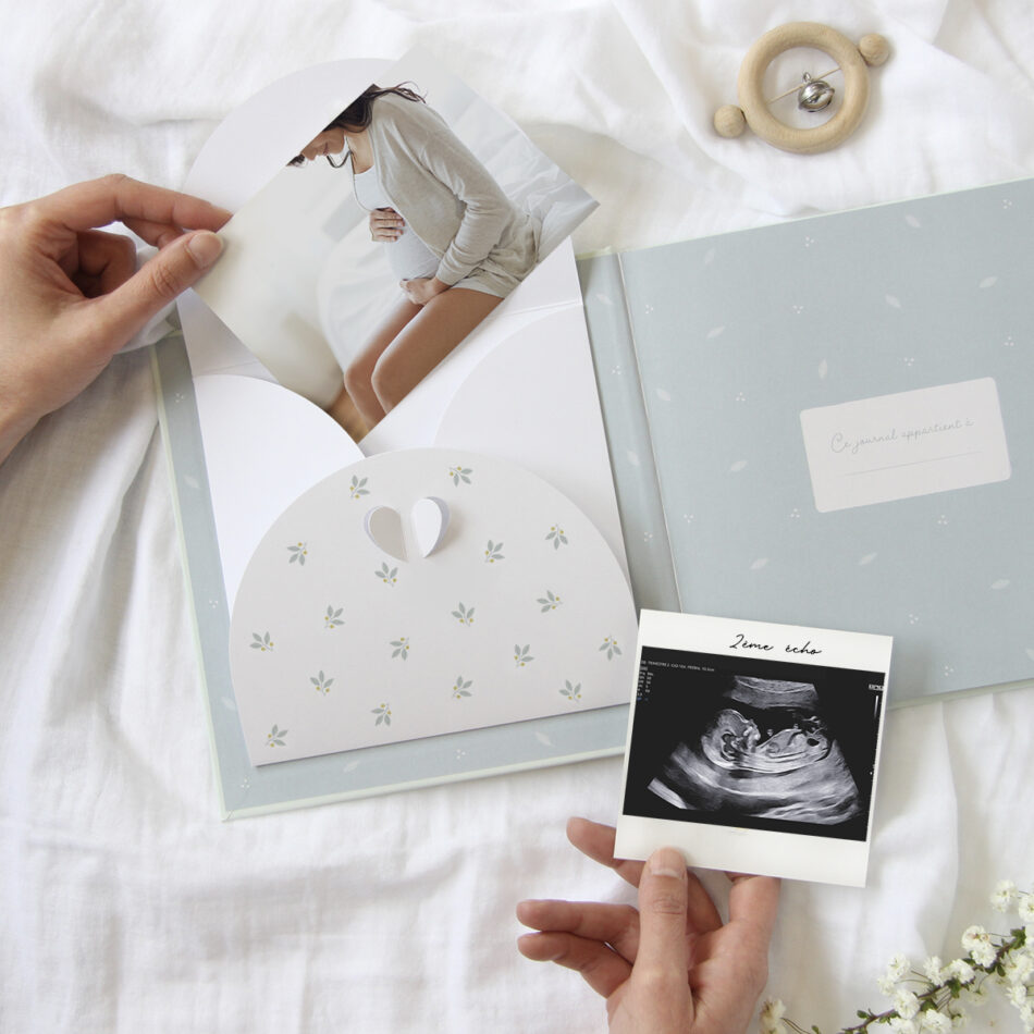 Une enveloppe intégrée permet de conserver précieusement les plus beaux souvenirs de ces instants uniques et précieux (photos du ventre, échographies, la future chambre, le faire-part de naissance…).